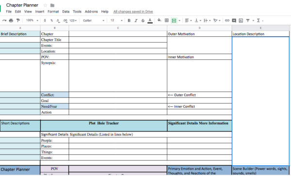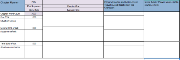 This is the lower half of the sheet. I find it helpful to separate the chapter into three parts and use escalating emotions, and increasing jeopardy to jack the tension of the chapter. I choose three emotions, escalating in intensity for the chapter. For this, the book The Emotion Thesaurus is very helpful. But if you want to use the online version, I suggest ponying up for a monthly subscription of One Stop for Writers which was created by the authors of The Emotion Thesaurus as well as their other fine thesauri. Pro hint: It’s so much easier copying and pasting the information you want to use than typing it from the book. 🙂