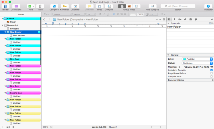 Easy peasy, right? If you divide up your novel in these parts before you start your pacing will move along snappily, without the drag in Sturm und drang. If you need to improve your pacing in your current novel, import it into Scrivener and color code away. With the structure of your novel exposed you should be able to make corrections to get back on course.